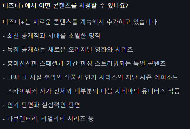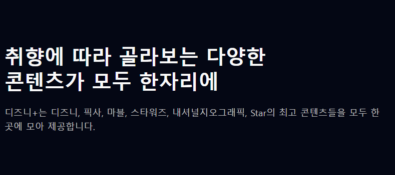 디즈니플러스는 기존의 TV 채널과는 달리, 디즈니 브랜드 콘텐츠를 독점으로 제공합니다. 디즈니플러스에서는 디즈니 애니메이션 클래식부터 최신 영화, 디즈니 채널의 인기 TV 프로그램, 마블 시네마틱 유니버스, 스타워즈 영화와 TV 프로그램, 핫스타의 인기 콘텐츠 등을 시청할 수 있습니다.