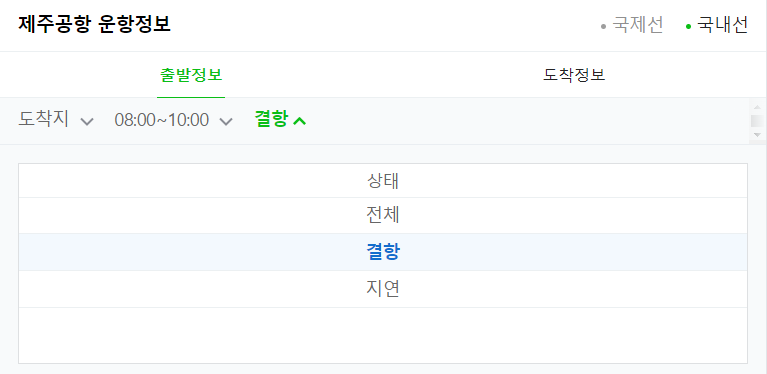 네이버 홈페이지에서도 확인이 가능한데요. 네이버 홈페이지에서 제주공항 운항정보 검색후 옵션에서 결항 선택후 검색해보면 현재 결항 지연 정보 확인이 가능합니다.