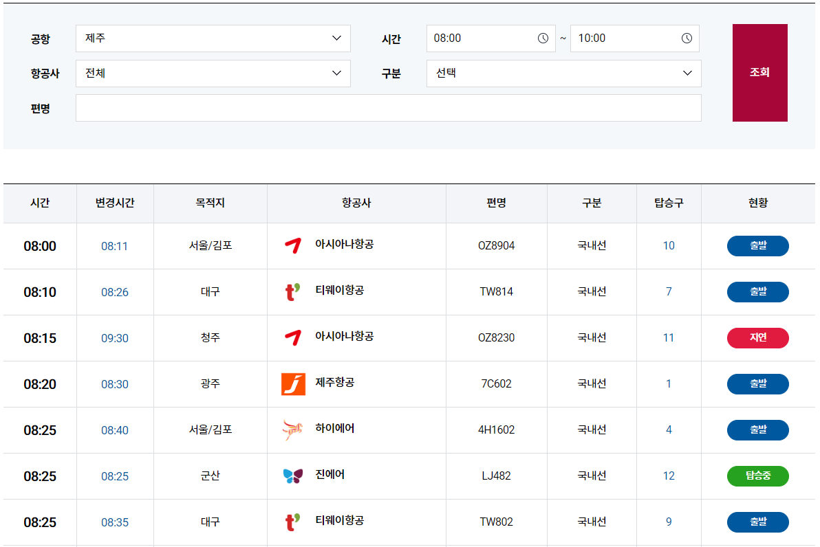 제주국제공항 홈페이지에서 항공기 출발 지연 결항정보등 스케줄 확인으로 가능합니다.