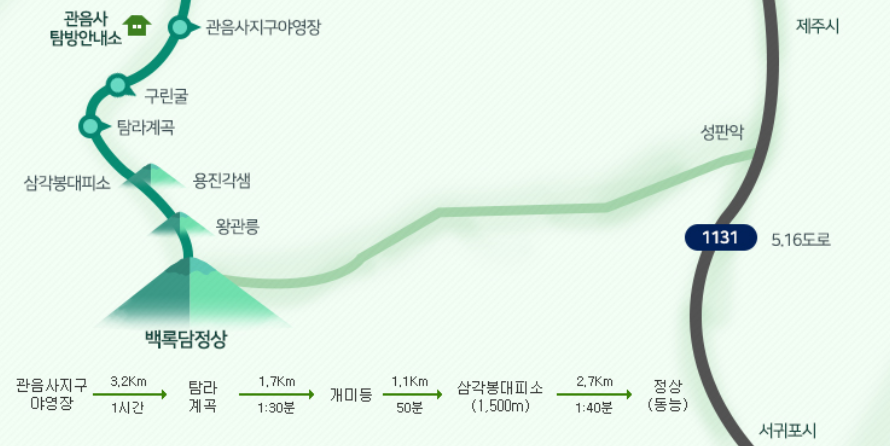 총 8.7㎞ [관음사지구야영장→삼각봉대피소(6㎞)→동능정상(8.7㎞)]